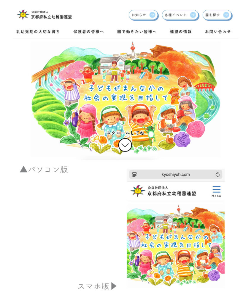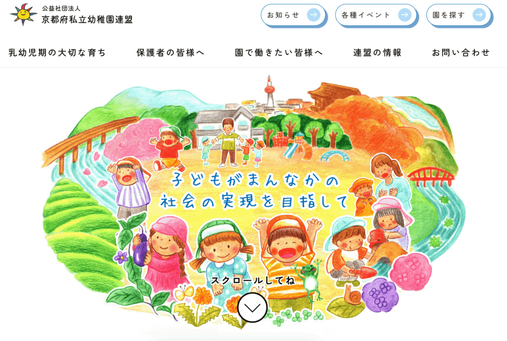 京都府私立幼稚園連盟様のホームページトップイラストを担当しました。幼稚園の園庭では、いろんな年齢の園児たちがそれぞれ楽しく生活しています。周りは京都の自然と四季、街並みをイメージして描きました。