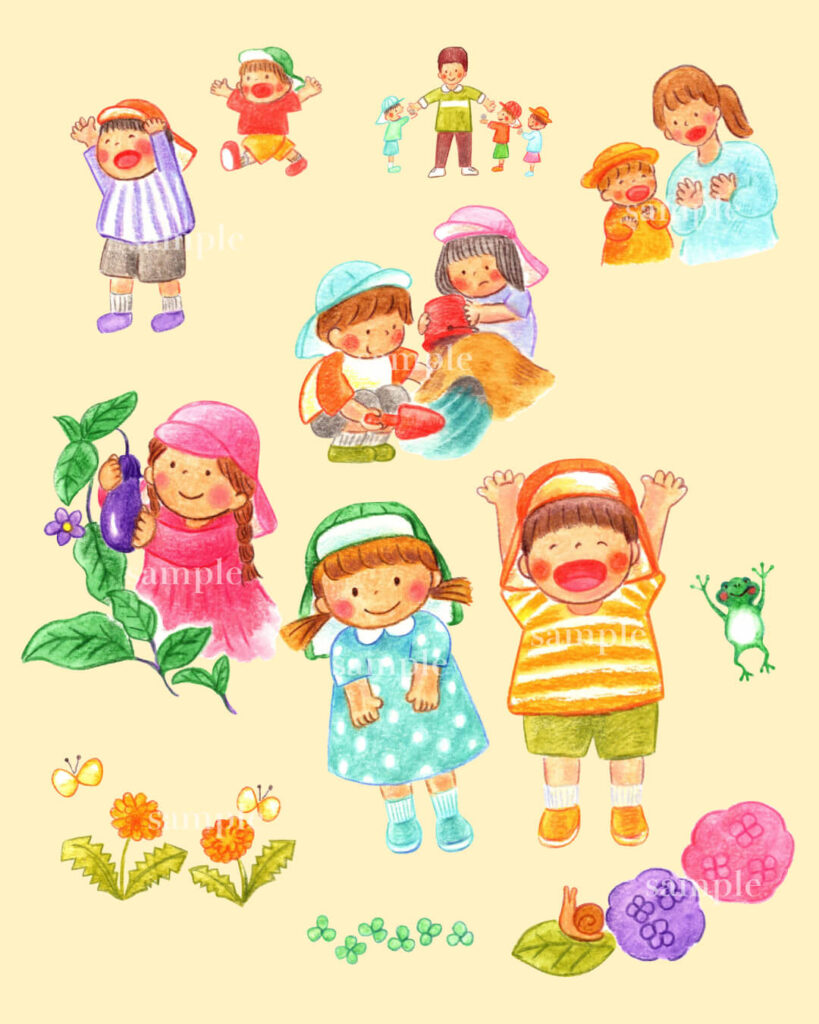 背景と各モチーフを別々に水彩色鉛筆で描いて納品しました。園児たちや、ちょうちょがひょこひょこ動くのでとっても可愛いです!